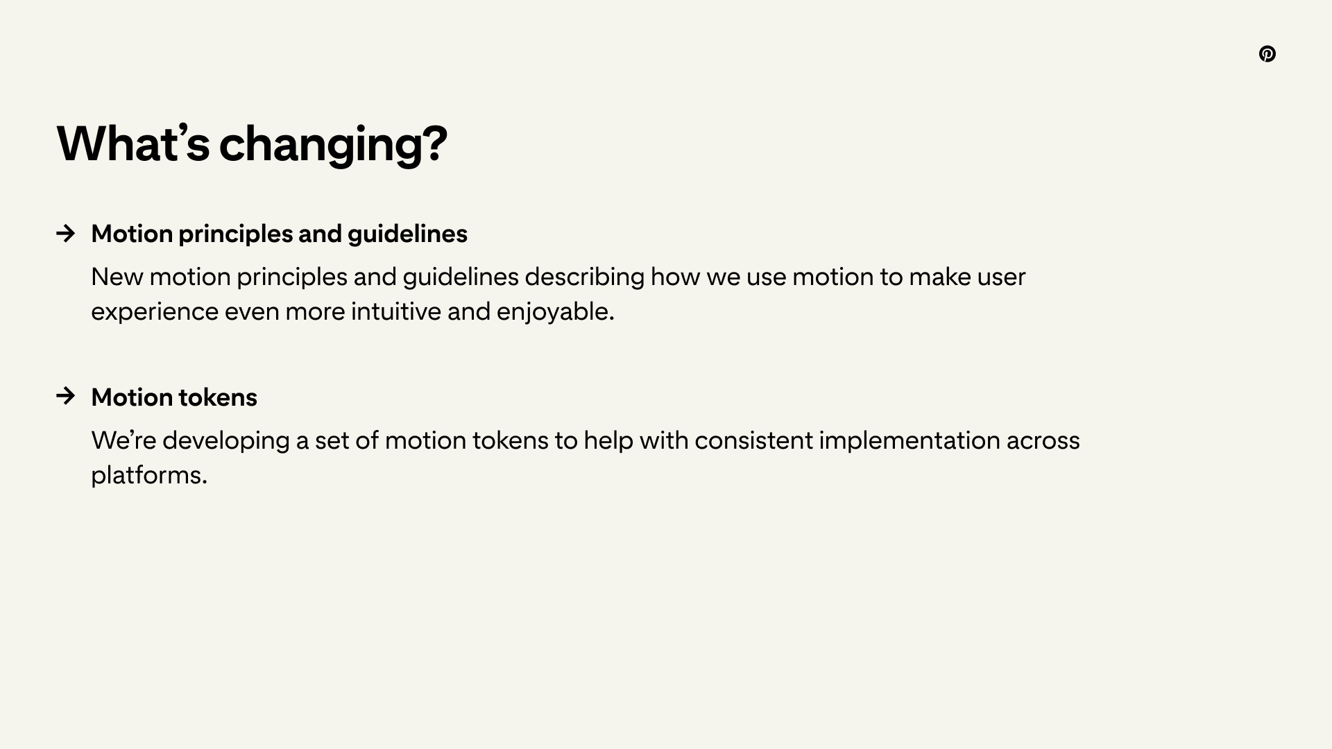 Pinterest was going through a major product redesign. Motion had no foundation to build on – no shared principles, no tokens, no specs. Every team made their own calls.