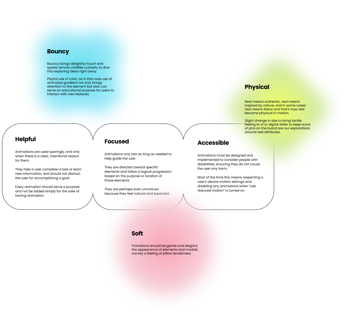Instead of shipping isolated animations, we set up a system that makes motion repeatable, consistent, and implementation-friendly. The result is motion that reinforces Pinterest’s brand and improves product clarity, while staying flexible enough to support fast-moving teams.